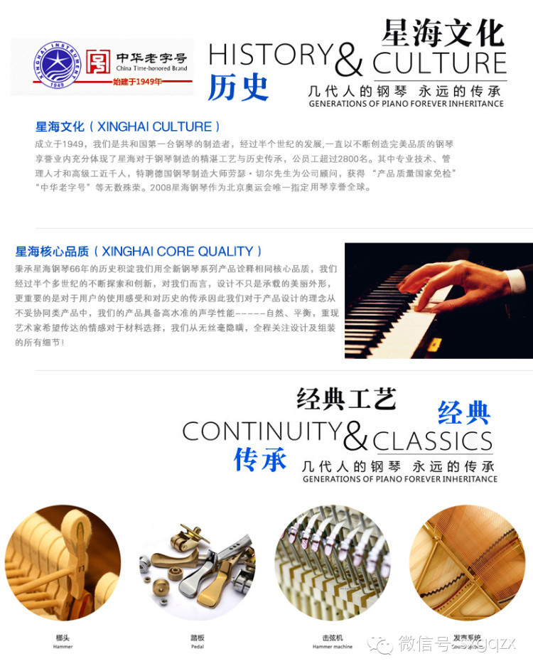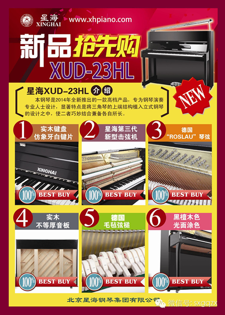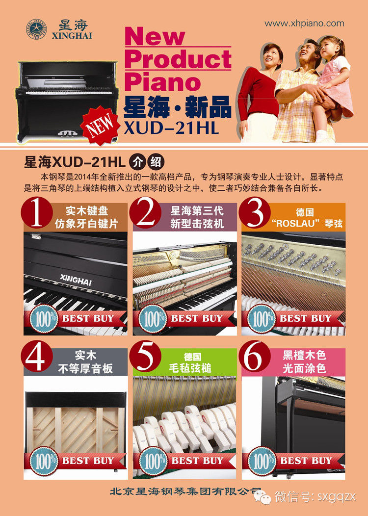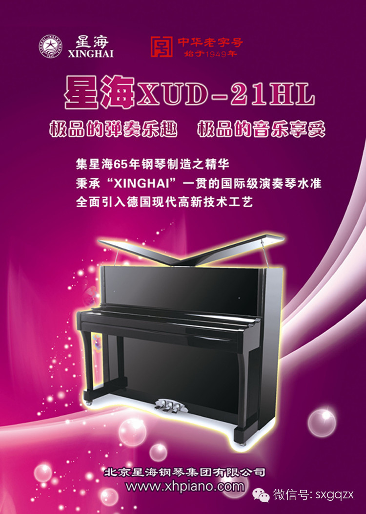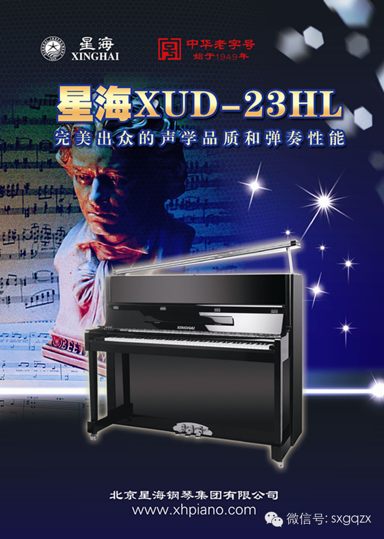星海“艺术家系列”XUD-21HL和 XUD-23HL立式钢琴是北京星海钢琴集团有限公司成立65年纪念特别推出的高端产品,由德国钢琴制造专家劳瑟·切尔先生设计,集星海65年钢琴制造之精华,秉承“XINGHAI”一贯的国际级演奏琴水准,全面引入德国进口高科技设备生产,欧式古典风格击弦机、德国毛毡榔头、“ROSLAU”琴弦、英国纯羊毛止音呢、进口实木不等厚音板、德国进口弦轴板、进口新型环保漆、实木键盘、使用仿黑檀木亚光黑键和进口防滑抗菌白键片、进口缓冲器、金属双轮脚轮等专业配置,使钢琴音色优美,音质纯净,音域均匀连贯,优良的音准,使产品具有完美出众的声学品质和弹奏性能。